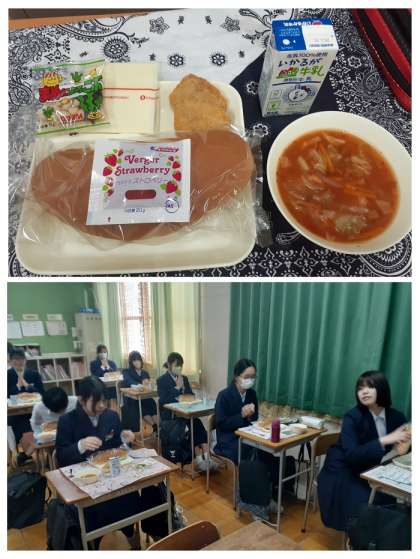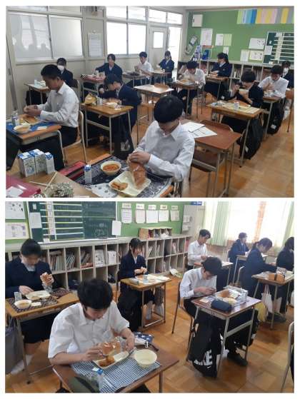 一口とんかつは、冷凍で配送されたものを、調理室で揚げたものです。一人に2枚ずつあり、スライスチーズとともにパンにはさんで、バーガー風に食べている生徒もいました。