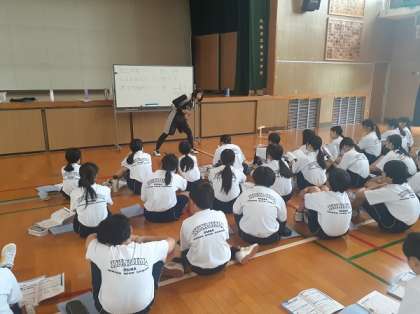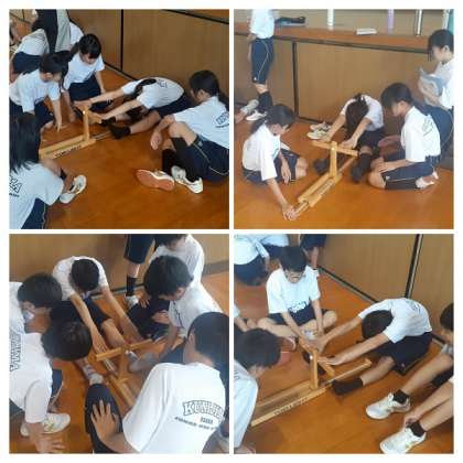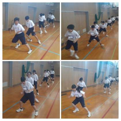 体育館で「長座体前屈」と「反復横跳び」の測定を行いました。