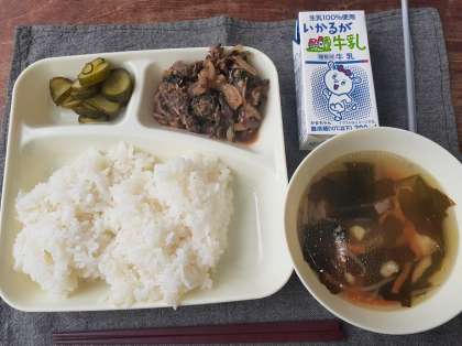 豆腐とわかめのスープは、もどした乾燥わかめと豆腐の他に、焼き豚、人参、もやし、えのきたけも具材に入り、豚骨スープ味で焼き肉店のわかめスープそのものでした。
