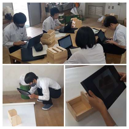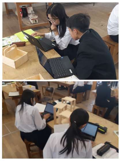 今日は、製品が完成した生徒から、学習者用端末を使って、Google-classroomに先生から事前に配付された基本となる「スライド」に、制作を振り返ってのレポートを作成し始めました。レポートには制作した作品の写真も学習者用端末で撮影し貼り付けます。他者にプレゼンできるよう、レイアウト、配色、文字の大きさなども考慮してスライドを作っていました。