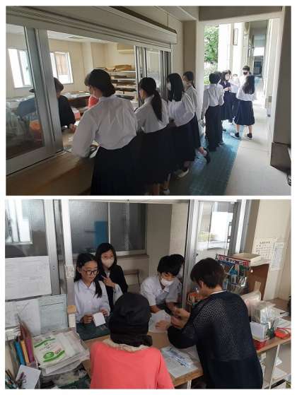 今日の昼休み、体育のプール学習で着用する水着の販売を「購買部」で行いました。主に1年生が購入に来ていました。だんだんと気温も暑くなってきました。プール学習が待ち遠しいですね。