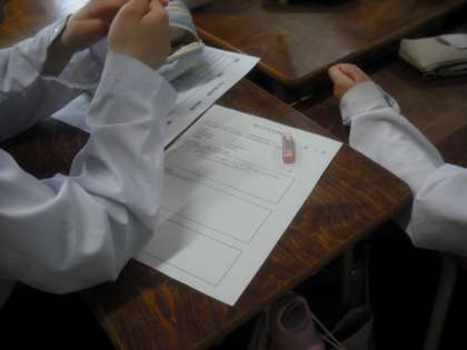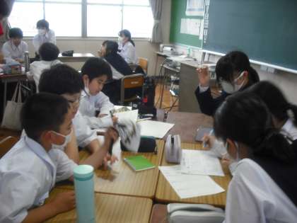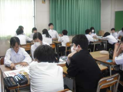 6時限目、1年生は「あたりまえ学習」で、地域のフィールドワークを行います。生徒たちは班で集まり、フィールドワークのコースを相談して、ワークシートに記入しました。