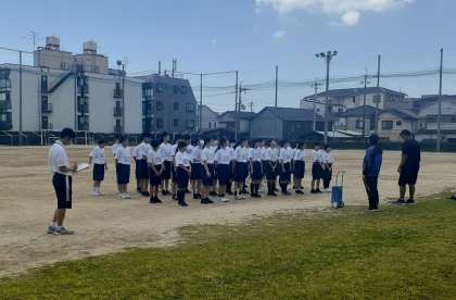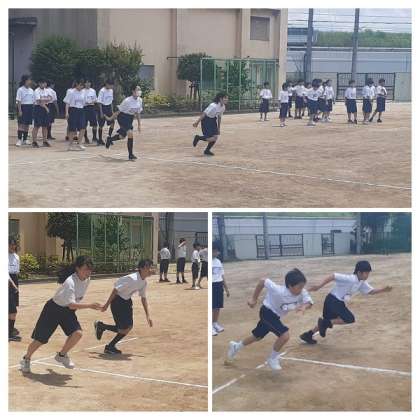 現在、全学年で取り組んでいる「新体力テスト」ですが、1年生については、50m走のスタートは「クラウチングスタート」となります。小学校までは「スタンディングスタート」だったため、今日は「クラウチングスタート」と「走法」の練習でした。当初はおぼつかないスタートでしたが、回数を重ねるごとに「スタートダッシュ」も力強くなっていきました。
