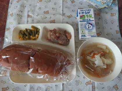 スープは、ワインで下味を付けた薄切りの豚肉と、人参、玉ねぎ、キャベツ、じゃがいもが具材のチキンブイヨン味のスープです。今日もお野菜たっぷりの具だくさんスープです。