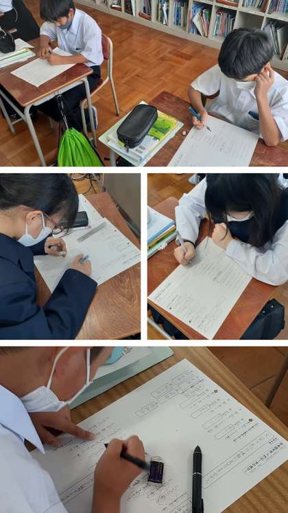 先生からのポイントの説明を聞いた後、プリントに書かれた練習問題を解いていきました。1文が長くなり文節が多くなると、やはり、混乱してしまう生徒が出ていました。基本は、ていねいに文節で区切ることです。そして、それぞれの文の成分の5つの種類の特徴に照らし合わせて見分ける必要があります。しっかりと復習しましょう。