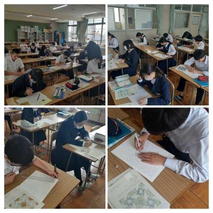 3年生の美術の学習の様子です。ゴールデンウィーク(5月2日)時には、コピー用紙にパターンを描き、色鉛筆で彩色をしていたのですが、今日、授業の様子を参観すると、画用紙に改めて自身のパターンを描きなおし(前回より用紙が大きくなっています)、ポスターーカラーで彩色をし始めていました。