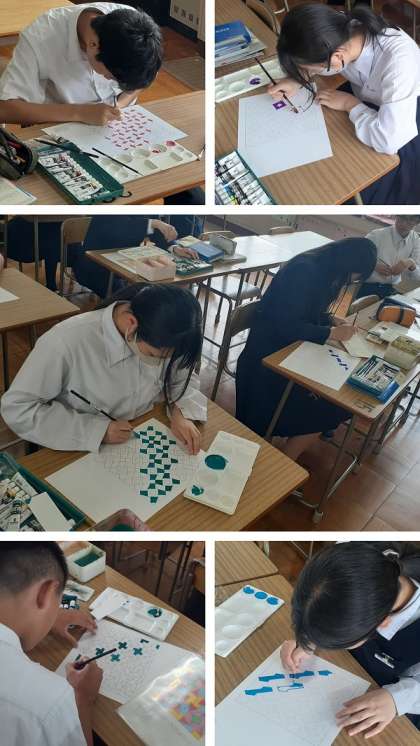 今日は、まず、基本となる1色を各自で定め、各種の筆を使い分けて彩色していきました。ルールは、グラデーションです。左上がスタートで、右へ行くにしたがって、また、下に行くにしたがって、「白」を混色し、色を薄くしていくようです。パレット上で少しずつ「白」を加え、ていねいに混ぜ込み、試し塗りの画用紙で色合いを確認しながら、塗り進めていました。