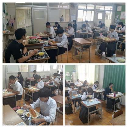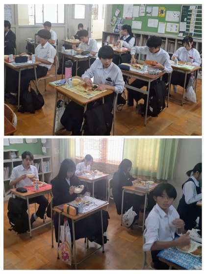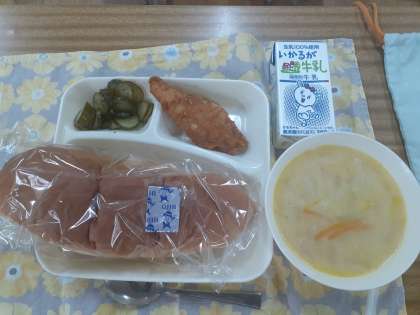 サーモンフライは、一人一切れあり、衣がサクサクに揚げられていました。塩コショウで下味が付いていたのですが、とんかつソースやタルタルソースなどがあればうれしかったね、と語っていました。パンにはさみ、サーモンフライバーガーにしている生徒もいました。