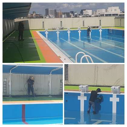 体育の学習でも、気温によりますが、6月の後半からはプール学習が始まります。去年の秋から使用を停止していた、汚れてしまったプールを、今日は業者に依頼して「プール清掃」をしていただきました。