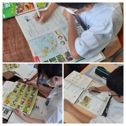 資料集や地図帳から必要な情報を読み取る力もかなり付いてきており、プリントにどんどんまとめられていきました。