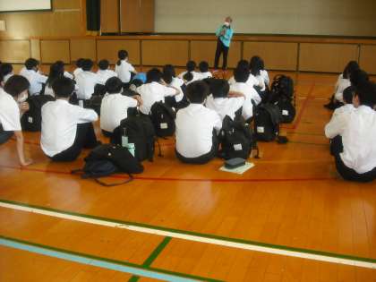 1年生は、明日がいよいよ一泊移住です。今日は、朝から一泊移住の荷物をもって登校し、5時限目体育館に集合して前日指導が行われました。迎畑先生から明日の一泊移住の活動でしっかり守ってほしい事、注意してほしい事などのお話を聞き、最終確認をしました。