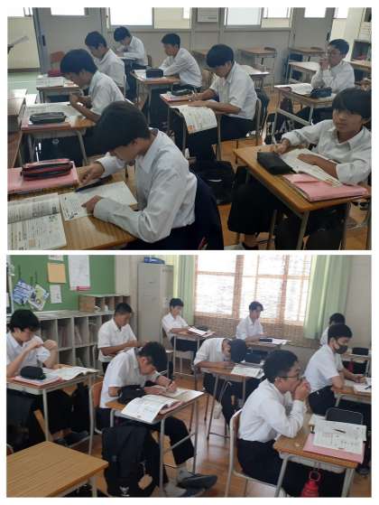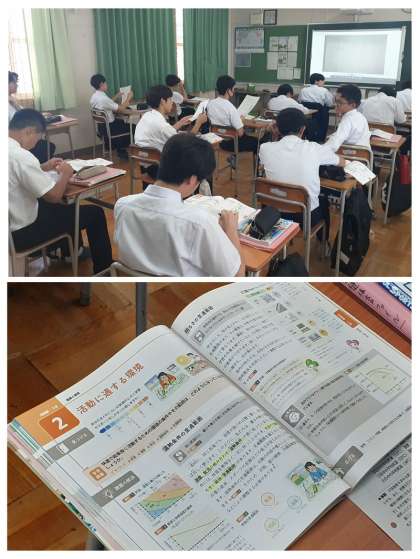 3年生男子の保健の学習の様子です。3年生になって初めての保健の学習で、学習内容は「第5章 健康と環境」です。