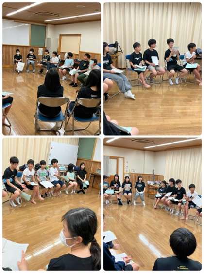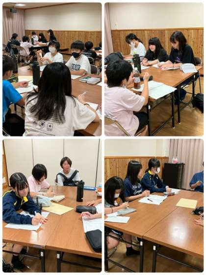 夕食後、クラスミーティングが行われました。1組は1つの輪になって、2組は班で、一人ずつ自分の目標とそのためにがんばっていることを発表しあいました。