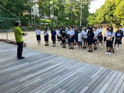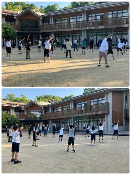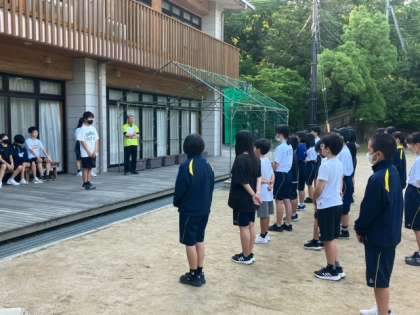 広場に集合して、朝の集いが行われました。班ごとに整列し、健康チェック、ラジオ体操、あいさつをしました。