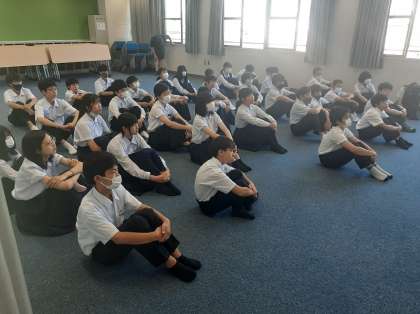 HPの記事で、いつも「25分の予鈴には集合整列が完了していました!」と紹介しているのですが、今日、正門でのあいさつを早めに切り上げ、「23分」に1年生の集会場所のLL教室に行ってみると、すでに集合・整列は完了、学年委員さんあいさつも終了、学年の先生からのお話に移っていました。1年生、時間に余裕の持った、素晴らしい行動ができています。