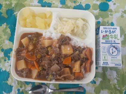 ハヤシライスは、牛肉、玉ねぎ、人参、じゃがいも、マッシュルームグリーンピースが具材です。ニンニクやセロリ、ローレルの風味の出ていて、本格的な味付けでした。ご飯にたっぷりとかけて、大きな口で、もぐもぐいただきました。