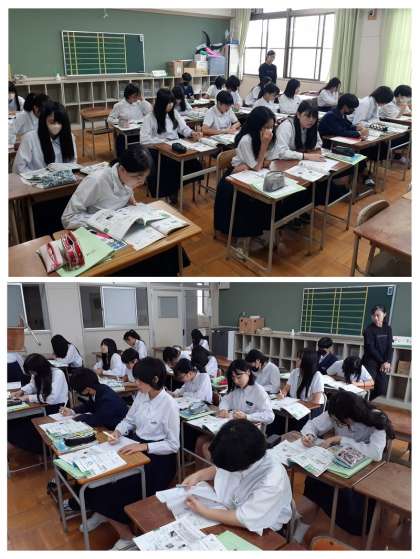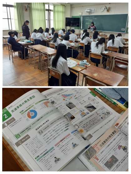 2年生女子の保健で、「傷害の防止」という単元を学習していました。今日のテーマは、「交通事故の発生要因」で、中学生にあたる13〜15歳の交通事故の発生状況(2020年で6590人)や、原因で一番多い「自転車の違反行為」の上位5種(安全不確認、一時不停止など)を知りました。