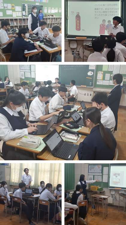 授業の後半では、「私の好きな(おすすめの)和食の調味料」というテーマで、学習者用端末を使って、インターネットで検索して画像や商品説明をゲットしてスライドを作成し、クラスで発表です。それぞれの家庭で、こだわりをもって長年使い続けられている「調味料」の紹介がありました。