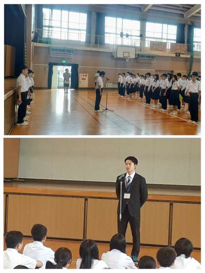 本来は昨日の予定ですが、教育実習期間が本日までのため、実習生のあいさつもあり、1日、延期して、今朝に行いました。教育実習の先生からは、3週間の実習で得た成果、教員になりたいという気持ちが強まったこと、生徒の皆さんへの感謝の言葉がありました。