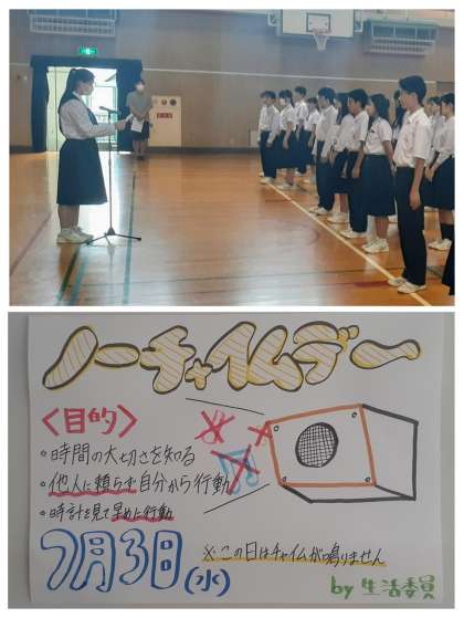 また、生活委員会からは、7月3日の「ノーチャイムデー」の取組についての説明がありました。1日、チャイムが鳴りません。それぞれが時間を意識してメリハリのある行動をしましょう。