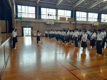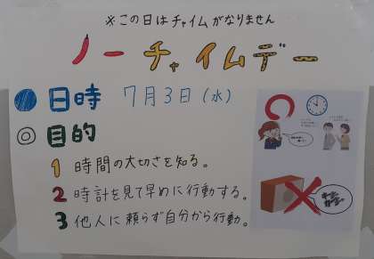 担当の先生からは、7月3日の「ノーチャイムデー」の取組についての説明がありました。その日1日中、チャイムが鳴りません。各自が時間を意識して、みんなで声かけあって、時間を守った行動をしましょう。