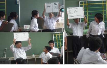 その後、非常持ち出し品は、どんなものがあるかを班単位で相談し、ホワイトボードに表わしました。そして、班の代表がホワイトボードを見せて発表し、全員が各班の回答を共有しました。