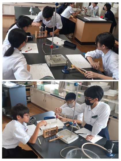 2年生の理科の学習の様子です。理科室で「炭酸水素ナトリウム」という物質の過熱による化学変化を調べる実験です。