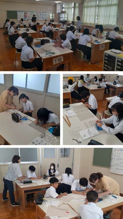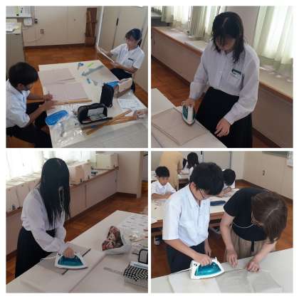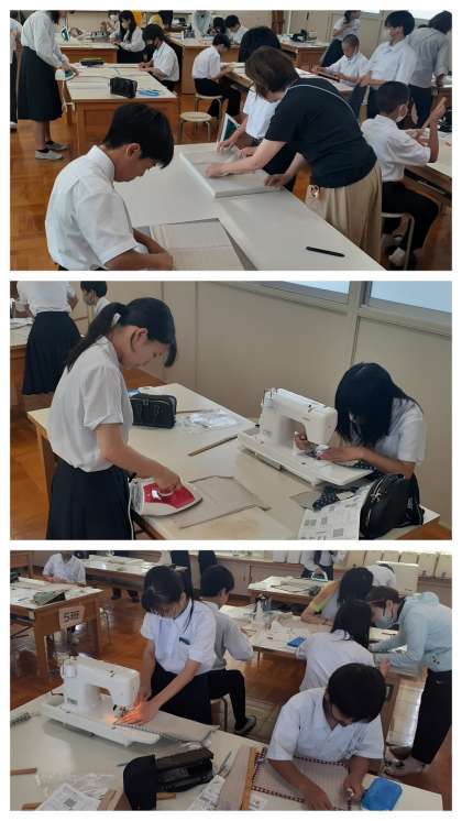 今日は、説明書で制作物の寸法を確認し、チャコペンシルで採寸・しるしを入れ、裁ちばさみで生地の裁断を行いました。その後、切り口がほつれないように3つ折りにしアイロンがけです。早い生徒は、早速、ミシン掛けにも進んでいました。