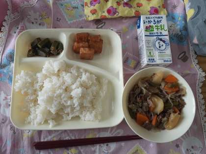 肉じゃがは、薄切りの牛肉、じゃがいも、玉ねぎ、人参、糸こんにゃく、三度豆と具だくさんで、砂糖、みりん、しょうゆ、料理酒でしっかりと味付けされ、じゃがいもやお野菜も味が浸み込むまで煮込まれていました。