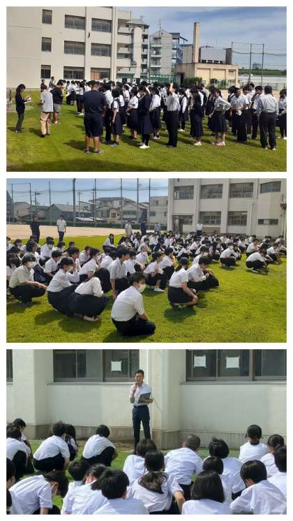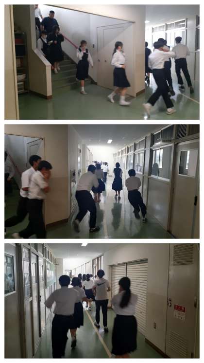 「4階調理室から火災が発生しました」の校内放送の合図で、中央階段は使わずに、西階段と東の非常階段を使って、担任の指示に従い、ハンカチで口を塞ぎながら、グランドへ避難しました。