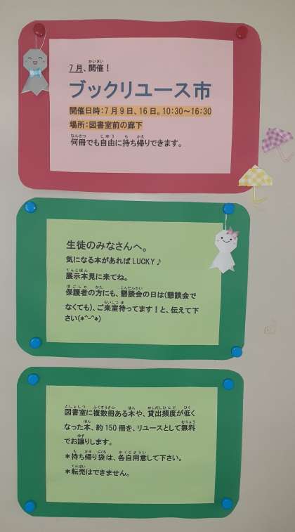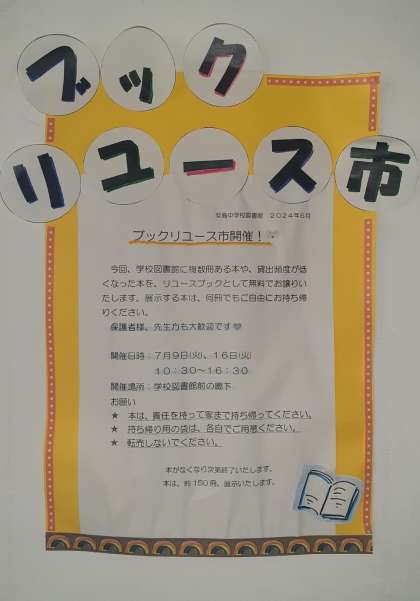 昨年からの取り組みで、学校図書司書の先生、文化委員会担当の先生や生徒の委員さんのご協力で、今年も「ブックリユースデー」を開催します。