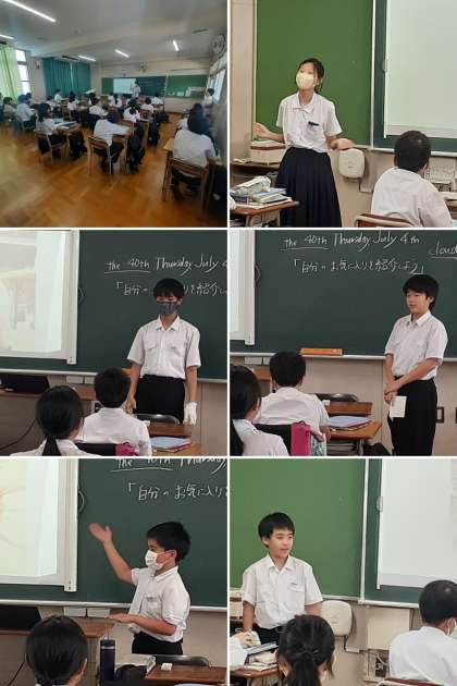 1年生の英語の学習の様子です。1年生でも、これまでに学んだ学習内容をもとに、「This is my favorite something!!」として、自分の好きな、家族、キャラクター、有名人、ペットなどを紹介する英語スピーチ発表を行いました。