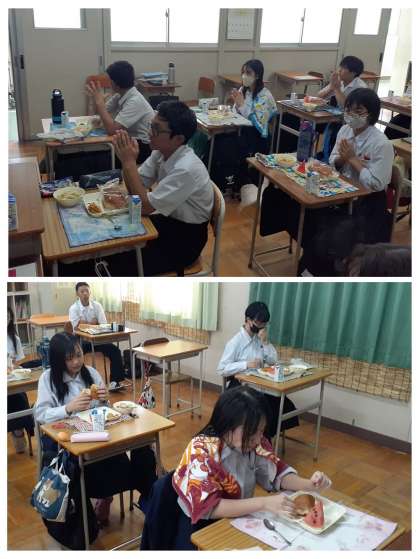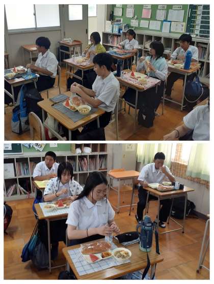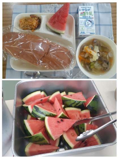 スイカは、大玉のスイカを、給食調理員さんの見事な包丁テクで、64等分にカットされています。