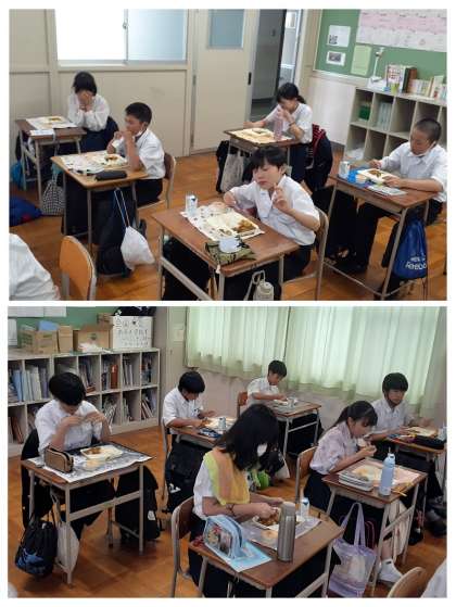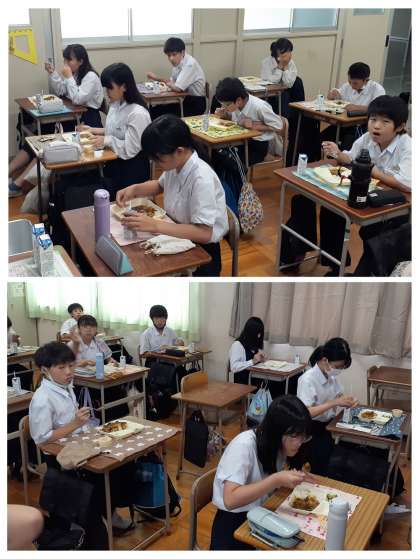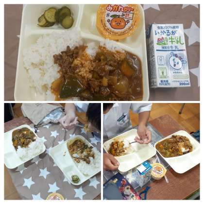 ナスやピーマンを苦手とする生徒もいましたが、カレーライスは人気給食メニューです。お替りで、2皿目の生徒もいます。