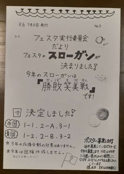 昨日の第3回フェスタ実行委員会と団長・副団長会議での協議内容から、全生徒に周知するものです。