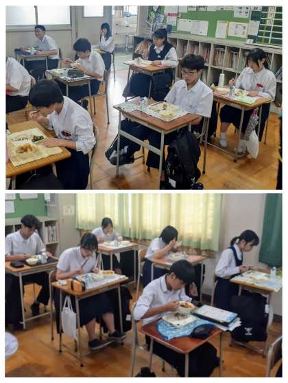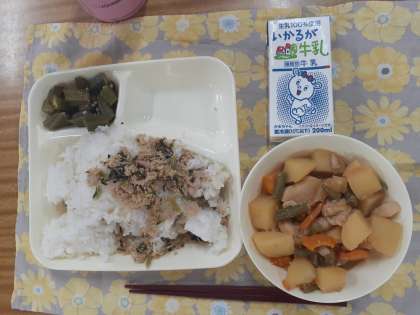 鶏肉と野菜のみそ煮は、鶏肉、たけのこ(水煮)、乾燥しいたけ、人参、玉ねぎ、じゃがいもを削り節の出汁(乾燥しいたけの戻し汁も使用)で煮込み、赤みそで煮含めています。最後に彩もあって三度豆が加えられています。