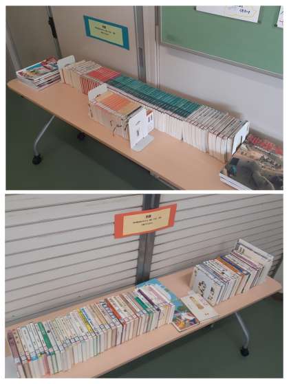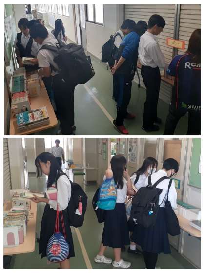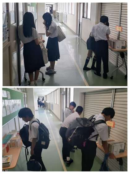今日も朝から図書室前の廊下に本を並べています。休み時間や、給食後の下校時には、多くの生徒たちが本を探しに来てくれていました。すでに20冊ほどの本が引き取られていました。