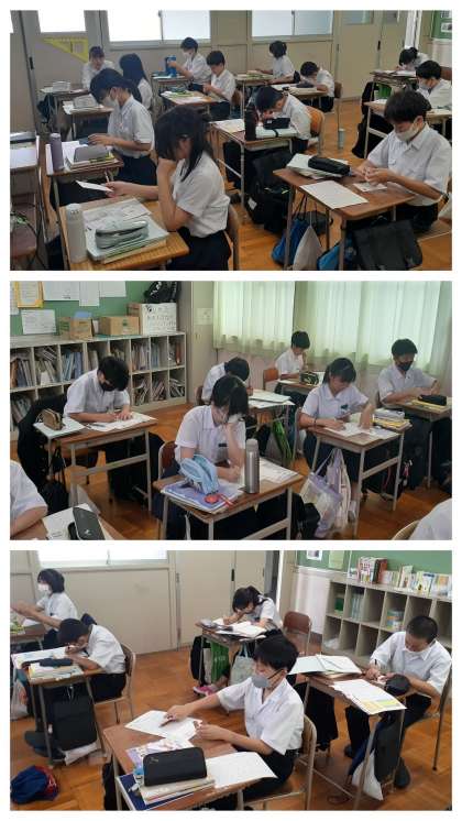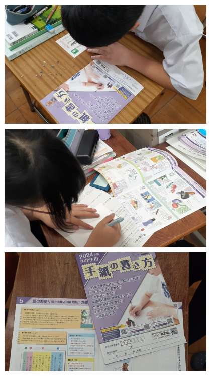 今日は、「手紙の書き方」というリーフレットを参考に、1人1枚ずつの郵便はがきが配られ、各自がそれぞれお世話になった柴中の先生へ「暑中見舞い」のはがきを書くという学習でした。 文面をしっかりと考え、気持ちを込めたていねいな文字で、まずは、鉛筆で下書きをし、清書はサインペンやボールペンを用います。