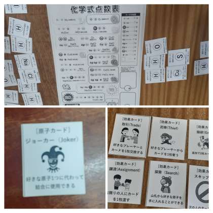 水素、酸素、炭素、窒素、塩素、ナトリウム、銀、鉄、銅、硫黄の10種類の「原子カード」に加えて、遊び要素の「ジョーカー」や「効果カード」もあります。手札をうまく組み合わせて、より高い点数の分子を作っていきます。HCl(塩化水素)は3点、NaOH(水酸化ナトリウム)は4点、Ag2S(硫化銀)は10点などです。