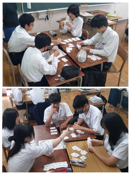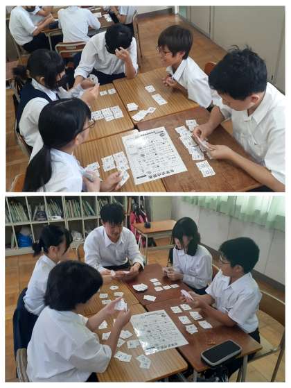 2年生の理科の学習の様子です。このクラスも理科の学習が1学期の最終ということでした。この前の授業より原子や分子の学習に入っており、今日は、先生オリジナルのカードゲームで、原子や原子の組み合わせで作っていく分子について、班で楽しんでいました。