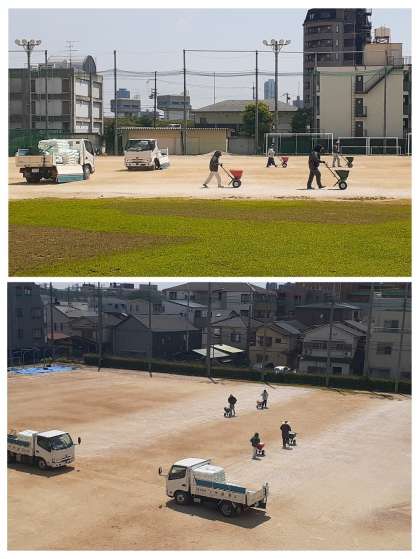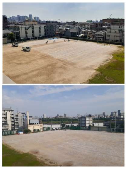 週末にかけて、ラグビー部もグランドを使用しないので、業者に依頼し、半日をかけてグランドの全面ににがりを撒いてもらいました。