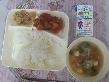 ヤンニョムチキンですが、「ヤンニョム」は甘辛いタレのことを言うそうです。おそらく給食初登場メニューかもしれません。正しい情報があれば教えてください。しょうが汁、にんにく、料理酒で下味を付けた鶏肉をでん粉を付けて菜種油でカリッと揚げ、みりん、しょうゆ、ケチャップ、辛みの素のコチジャンを加えて作ったタレで絡めます。普段の「鳥から」にひと手間加わっていますね。大人気で、多くの生徒がお替りの手を挙げていました。