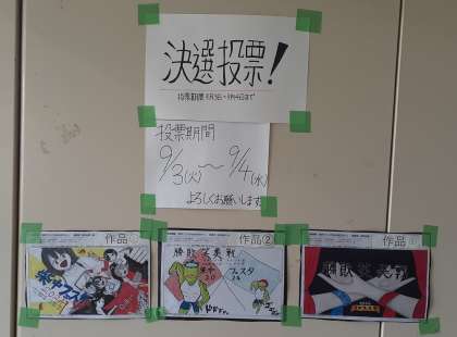 柴中フェスタのポスターの投票結果です。先週の学習者用端末からの生徒のみんなからの投票では、3枚が同票となり、決戦投票となりました。3つのポスターが本日発表され、明日、あさっての2日間での再投票です。