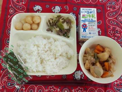 一口がんもと里芋のみそ煮は、削り節の出汁に、里芋と一口がんもどき(丸い物)、人参、玉ねぎ、三度豆が具材で、赤みそを加えて煮込まれていました。里芋も柔らかく、がんもどきにもお出汁がたっぷり浸み込んでいておいしかったです。