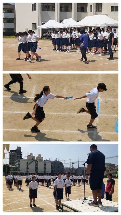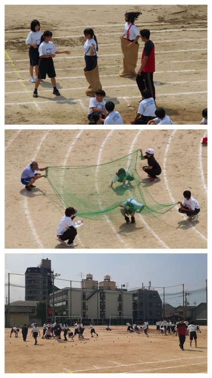 写真は、 男女混合バラエティーリレー・玉入れ・3年学年競技・団対抗リレー・閉会式 です。