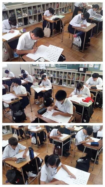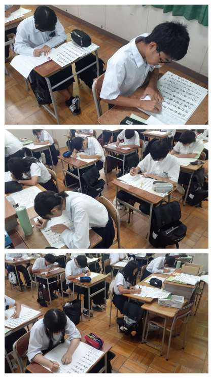 まずは、お手本を紙の下に敷き、写すことから始めました。次いで、お手本を見ての「清書」です。本来は、多くの生徒に「筆ペン」で挑戦してほしかったのですが、連なった文字を書くことがとても難しいらしく、ほとんどの生徒は、「鉛筆での清書」となっていました。