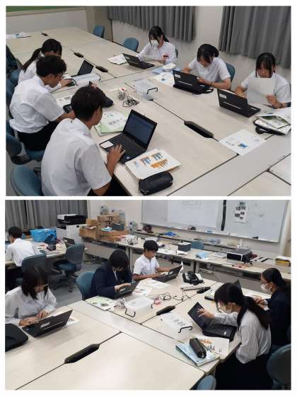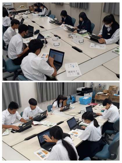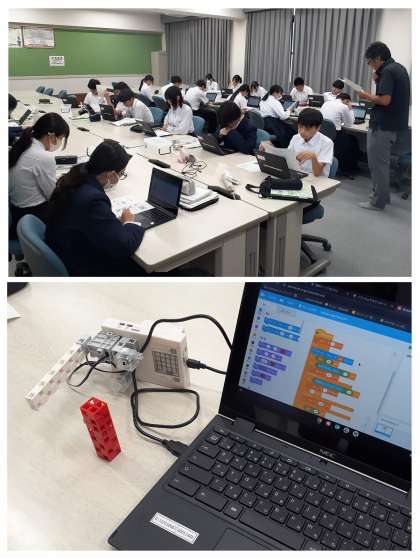 3年生の技術の学習の様子です。今日はパソコン教室にて、実際に、学習者用端末を使って、プログラムを作成・入力し、それをロボットにダウンロードして、命令通りに動く・反応するかを確かめました。