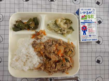 他人丼は、昆布と削り節の合わせ出汁に、料理酒で下味を付けた牛肉、人参、玉ねぎを加えて煮込み、砂糖、みりん、しょうゆで味付けをし、彩りに青ネギ、最後に溶き卵を流し入れて完成です。お皿に盛り付けたご飯に配膳時に具材をかけて、おいしくいただきました。牛肉たっぷりの丼でした。