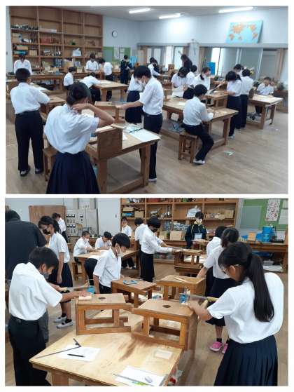 1年生の技術の学習の様子です。今日は技術室に移動し、これまでに「けがき」を行った木材の切断作業です。
