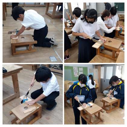 のこぎりの引き込み角度は、20度から30度くらいが適度なのですが、どうしても、のこぎりと木材の角度が付けにくく、平行となってしまい、引っ掛かりや摩擦が多くなり、切断しにくくなっている生徒が多かったです。